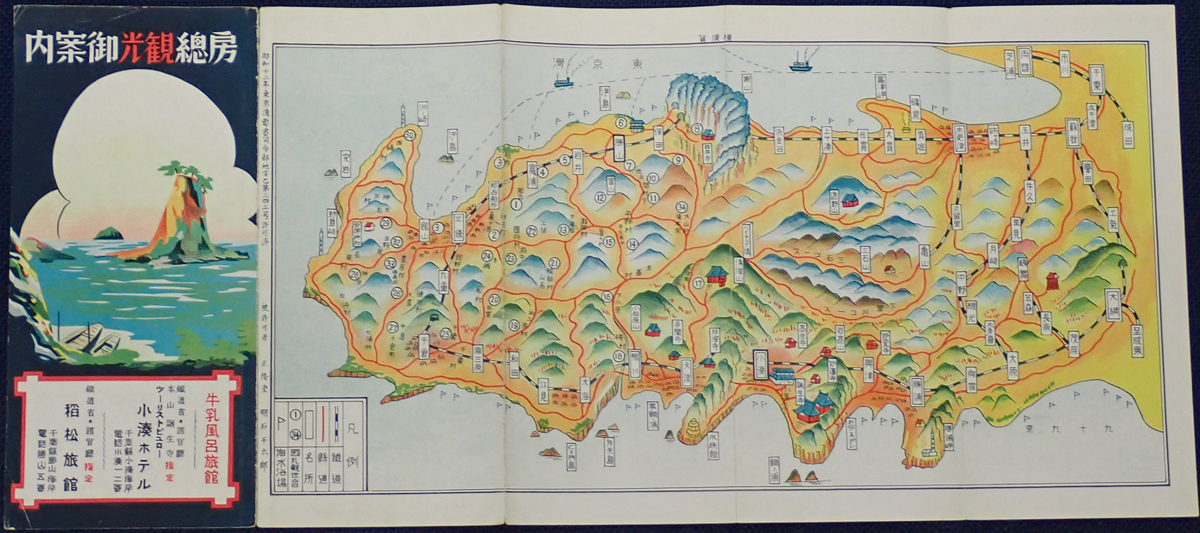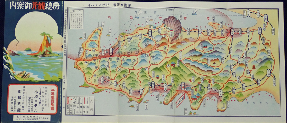 館山は東京湾の入口として国防の重要拠点でありながらも、避暑避寒に適していることから多くの観光客が訪れる地でもありました。昭和12年(1937)まで館山を訪れる観光客数は伸びていましたが、次第に観光客への規制も厳しくなって行きます。禁止事項を知らずに撮影をして要塞地帯法に違反する人も多く、地域に居住する人々に限らず要塞地帯を訪れる人々にも知られるよう地図の発行等周知活動が行われました。また、観光地である館山では絵はがきが多く発行されましたが、館山湾内の地形がわかる絵はがきからは山が消されています。